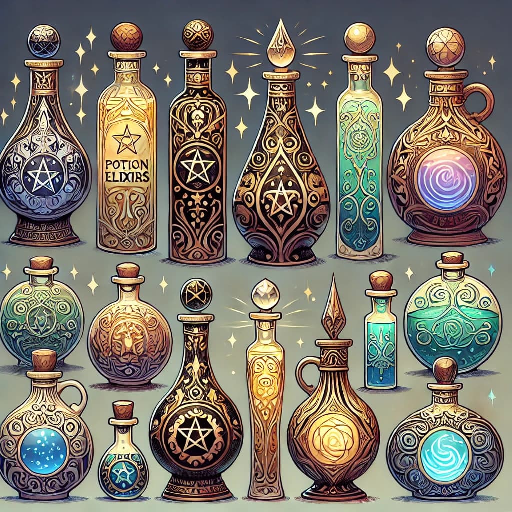 Beautifully crafted potion bottles and goblets designed to look like ancient alchemical elixirs. Perfect for serving drinks or as decorative pieces, each set comes with a magical backstory and enchanting names like “Elixir of Vitality” or “Potion of Serenity.” Handcrafted with meticulous attention to detail, these vessels evoke the mystery and allure of old-world alchemy. Each bottle and goblet features intricately etched designs inspired by arcane symbols, celestial patterns, and mythological motifs, giving them an authentic, timeworn appearance. Whether fashioned from polished glass with metallic accents or rustic ceramic with an iridescent glaze, the materials and finishes are carefully chosen to bring a sense of magic and sophistication to every sip.